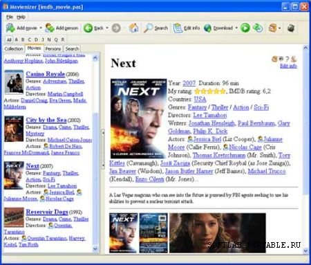 Любите ли вы кино? Интересуетесь фильмографией актеров? Коллекционируете фильмы? Если вы ответили 3 раза "да", то именно для вас мы несколько лет делали Movienizer - мощный каталогизатор фильмов, совмещающий функции энциклопедии. Вы можете загрузить информацию о фильмах, актерах и режиссерах из Интернета, просто введя нужное название или имя и нажав кнопку "Скачать". Полученные данные (описание, обложка, рейтинг IMDB, сборы по миру, бюджет, кадры, фильмография) хранятся в локальной базе данных, поэтому вы всегда сможете мгновенно вспомнить в каком фильме играл понравившийся герой или уточнить описание фильмов.