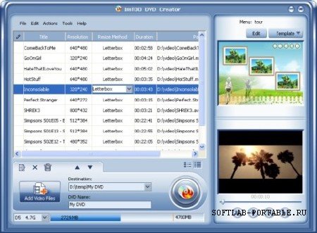 Быстрый и легкий в использовании конвертер DVD. Он поддерживает и конвертирует почти все популярные видео- форматы в DVD и записывает на DVD, поэтому вы сможете посмотреть их на домашнем проигрывателе DVD. Создатель DVD (так переводится Creator) также обеспечивает много красивых меню для вашего DVD, поддерживает DVD-R, DVD+R, DVD-RW и DVD+RW. Для того, чтобы сделать свой DVD, достаточно нескольких нажатий на клавиши! Поддерживает большое количество видео-форматов, включая AVI, mpeg, WMV, DivX, Xvid, VOB, 3GP, MP4, etc. Он позволит вам переключаться между NTSC или Pal, запишет диск DVD, сохранит iso-образ.