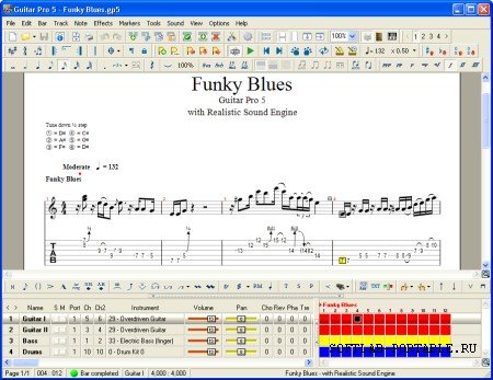 Редактор партитур для гитары, басс-гитары и банжо - позволяет создавать, редактировать, записывать, прослушивать, импортировать и экспортировать партитуру, причем запись производится по восьми трекам (семь гитарных и один - ударные), допуская при этом применение к каждому из них спецэффектов. Встроенный проигрыватель в Guitar Pro поддерживает одновременную работу с 256 треками и четырьмя MIDI-портами