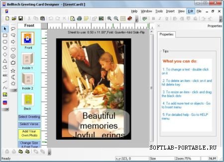 Проектировщик поздравительных открыток Belltech поможет создать поздравительные открытки профессионального качества в течение пары минут и сразу же их напечатать на любом Windows совместимом принтере. С программой идет с множество готовых шаблонов на тему Дня рождения, Свадьбы, Нового года, годовщин, Дня святого Валентина или любого другого случая, а также много иллюстраций и фоновых изображений.