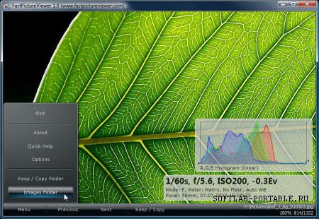 Просмотровщик графики (картинок, фоток) с минимальным количеством настроек, оптимизированный для как можно более быстрого просмотра файлов большого размера. Поддерживается просмотр отдельных файлов и целых папок, имеется набор самых простых опций. Среди поддерживаемых форматов особо стоит отметить JPEG и Microsoft HD Photo (*.hdp, *.wdp). Утилита позволяет с помощью одного клика мыши показывать снимки в натуральную величину, копировать фотографии в заранее предустановленные папки, добавлять рейтинги и ярлыки. Для более быстрого просмотра поддерживается аппаратное ускорение DirectX.