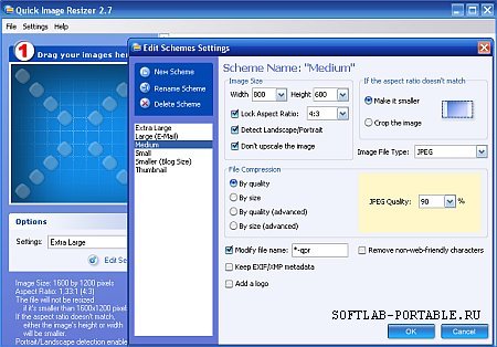 Лёгкая в использовании утилита для быстрого и удобного изменения размеров изображений перед выкладыванием их где-либо, например, в интернете. Программа позволяет выбирать схемы изменения размера изображений, перетаскивать необходимые фотографии в окно программы, после чего вы быстро сможете увидеть результат. В программе имеется возможность сохранения нескольких схем, после чего вы сможете просто выбирать их для изменения размеров очередной партии изображений. Программа может автоматически выбирать качество и уровень сжатия JPEG изображения, в зависимости от размера, который вы указали в настройках. Кроме того, в программе имеется возможность добавления собственных графических водяных знаков, например, с логотипом вашей компании или сайта. Программа легка в использовании и обладает простым пользовательским интерфейсом.