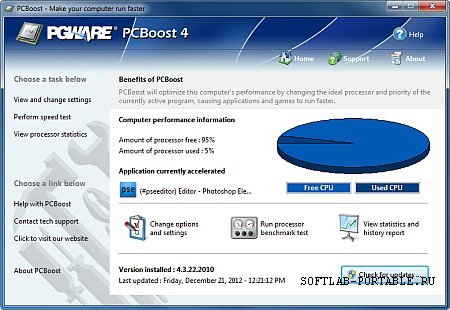 Утилита предназначена для автоматического освобождения ресурсов компьютера под запущенное приложение, что позволяет добиться прироста производительности работающих программ. PCBoost обладает простым интерфейсом и не требует сложной настройки — оптимизация работы компьютера производится в автоматическом режиме. PcBoost автоматически выставляет приоритеты для запущенных программ, что позволяет с максимальной эффективностью использовать мощность вашего процессора.