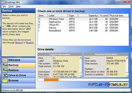 Простая в использовании и надежная программа для создания образов логических дисков и отдельных разделов. В работе DriveImage XML использует службу теневого копирования тома Microsoft's Volume Shadow Services (VSS), что позволяет создавать образы "на лету" даже с внешних накопителей. Создание образов логических дисков и отдельных разделов. Поддержка файловых систем FAT12, FAT16, FAT32 и NTFS. Восстановление образов с дисков без перезагрузки системы. Просмотр образа и извлечение из него отдельных файлов. Резервное копирование с диска на диск. Встроенный планировщик. Возможность загрузки с CD диска. Клонирование дисков. Сжатие резервных копий для экономии места.