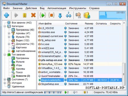 Мощное и удобное средство управление категориями закачек. Возможность автоматического распознавания типа файлов с помещением их в указанные категории. Неограниченное число категорий и уровней вложенности. Запиши Download Master Portable на флешку или переносной диск и закачивай файлы на любом компьютере подключенном к Интернету. Данная версия не требует установки, не сохраняет свои настройки в реестре и не изменяет настройки обычного Download Master.