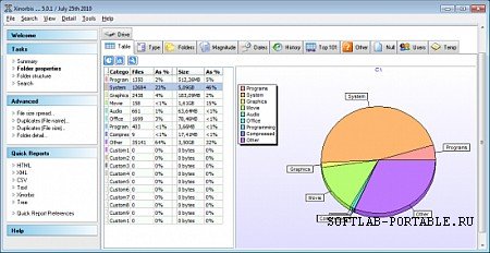 Xinorbis is a simple but powerful hard disk analyser. Using a sophisticated mix of graphs, tables and tree displays, it gives the user a complete overview of the contents of a hard disk, folder, removable or network drive. It makes it easy to see the contents, structure and file distribution and file composition of a whole hard disk, directory, or mapped network drive. Includes full report creation.