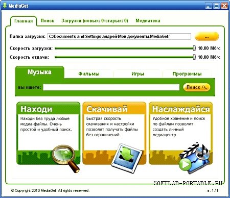 Информация о программе: Название: Portable MediaGet Версия: 1.11 Год выхода: 2010 Разработчик: na Платформа: Windows XP/2003/Vista Язык интерфейса: Русский Размер: 14.9 MB Информация для восстановления: 3% Лекарство: не требуется Пароль на архив: нет