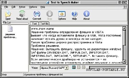 Информация о программе: Название: Portable Text to Speech Maker Версия: v2.0.1 Год выхода: 2010 Разработчик: xrlly.com Платформа: Windows XP/2003/Vista Язык интерфейса: Английский Размер: 8.05 MB Информация для восстановления: 3% Лекарство: не требуется Пароль на архив: нет